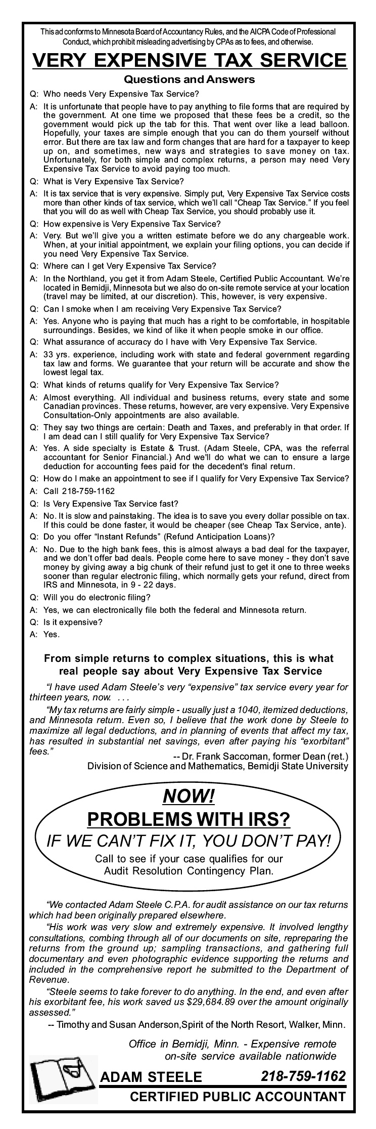 2. VERY EXPENSIVE TAX SERVICE (an advertisement)